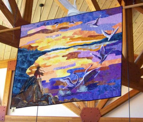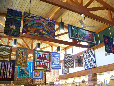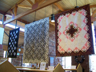 Each year, the local quilters of Sedona generously share with us their latest quilts to hang from the beautiful, high ceilings in the Sedona Public Library. It’s quite a sight to see. We fill two rooms with quilts hung along the walls and from the rafters and show smaller ones in display cases. The quilt show ran from December 29, 2008, through February 12, 2009. The Library, just around the corner from our quilt store, is at 3250 White Bear Road in Sedona.